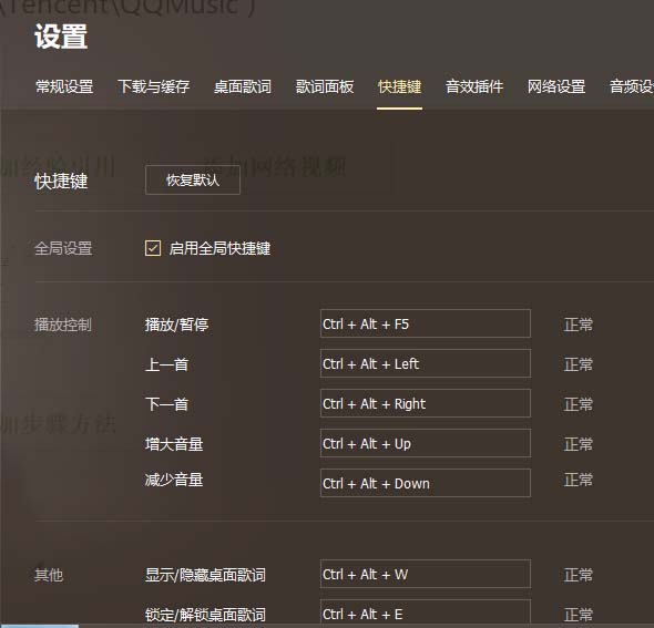 3、點擊上方快捷鍵選項確保播放暫停、下一曲、上一曲快捷鍵設(shè)置為如下顯示 如不是請選擇恢復(fù)默認(至此如果QQ音樂安裝的為C盤默認目錄媒體鍵盤已經(jīng)可以使用了,如果不是默認目錄或是不是QQ音樂請看步驟四介紹)