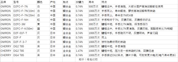 2、常見的微動如上表所示,手感方面需個人體驗后自行選擇。壽命方面表中數據為機械壽命,并非實際通電使用的電氣壽命。一般來說電氣壽命與產地和觸點材質有關,日產微動壽命長于國產,金觸點壽命長于銀觸點。