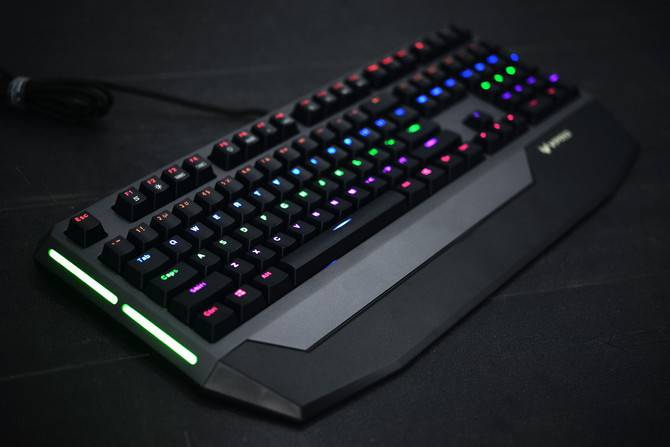 背光方面,雷暴V710沒有采用RGB背光,取而代之的是混合背光,說直白一點就是鍵盤上每一行LED的發(fā)光顏色都不一樣,可以理解為這是增強版的單色背光吧,不過多達10種背光模式足以證明V710的強大。除此之外,環(huán)繞鍵盤側(cè)面的發(fā)光燈條同樣給鍵盤增添了幾分科技感。