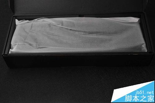 2、包裝打開可以看到鍵盤的內(nèi)部加固了一個黑色紙盒護(hù)住以及防塵白色泡沫袋防止鍵盤在運送中造成損壞。
