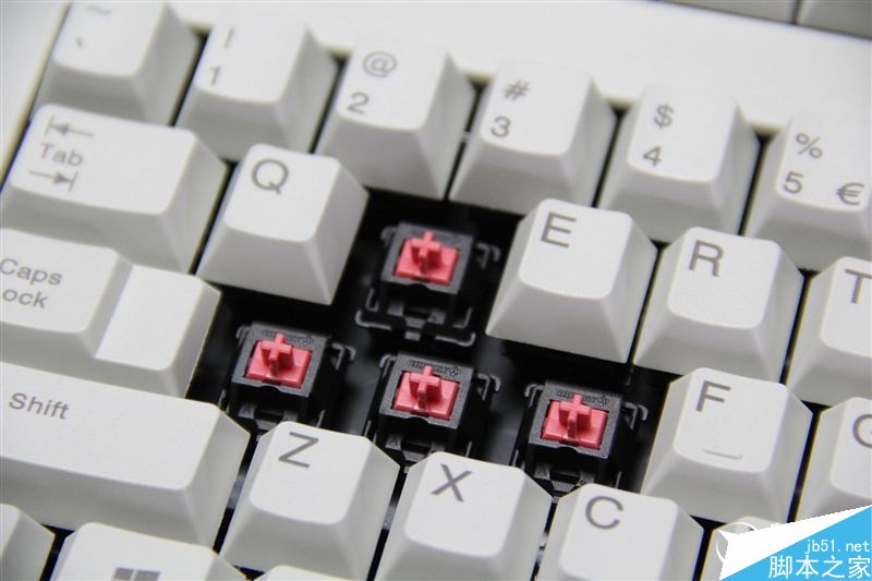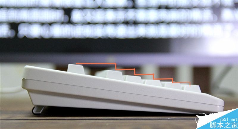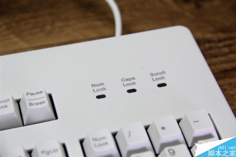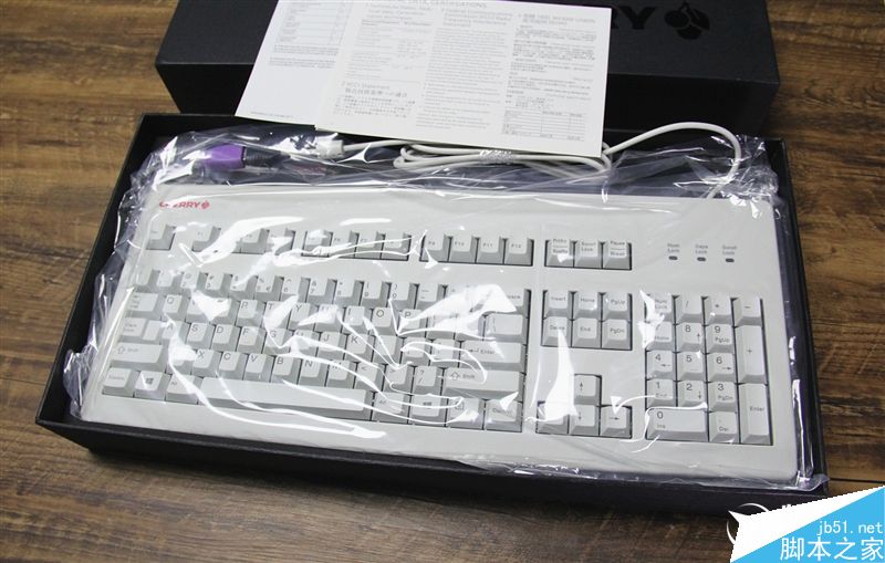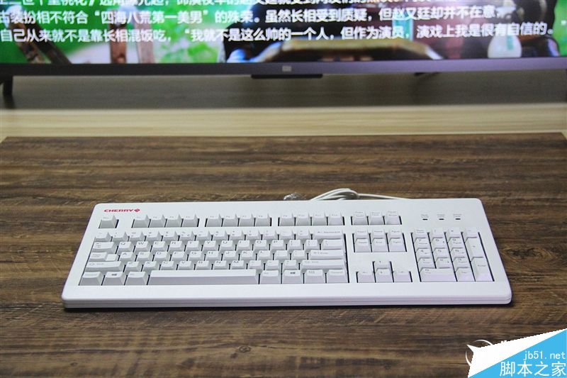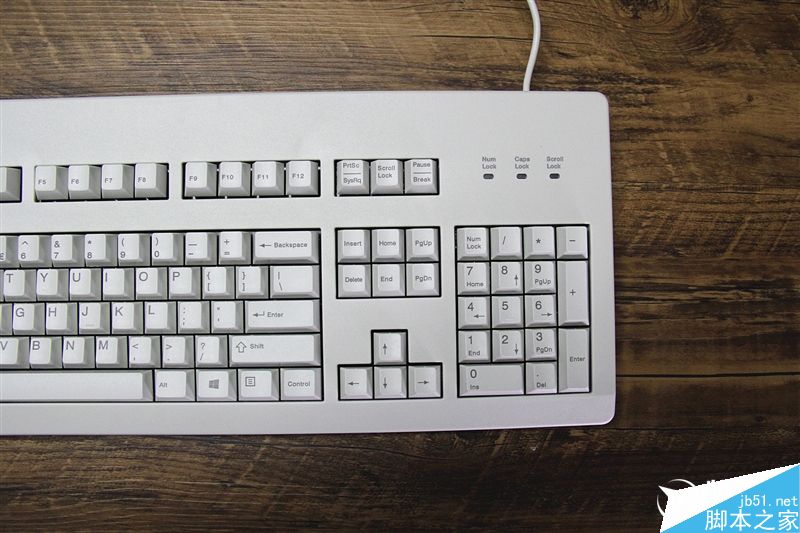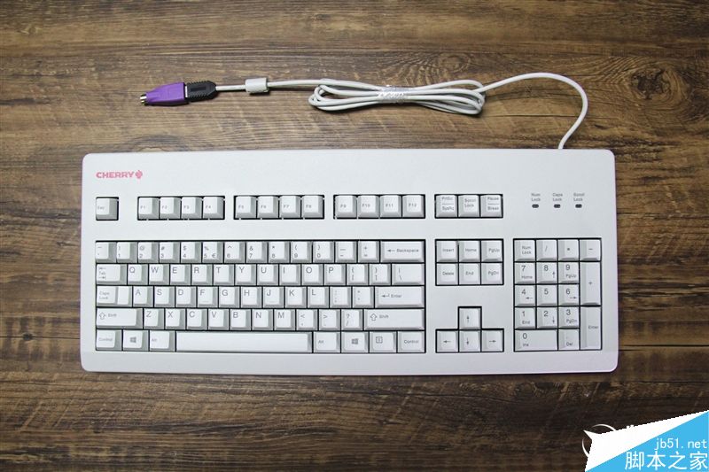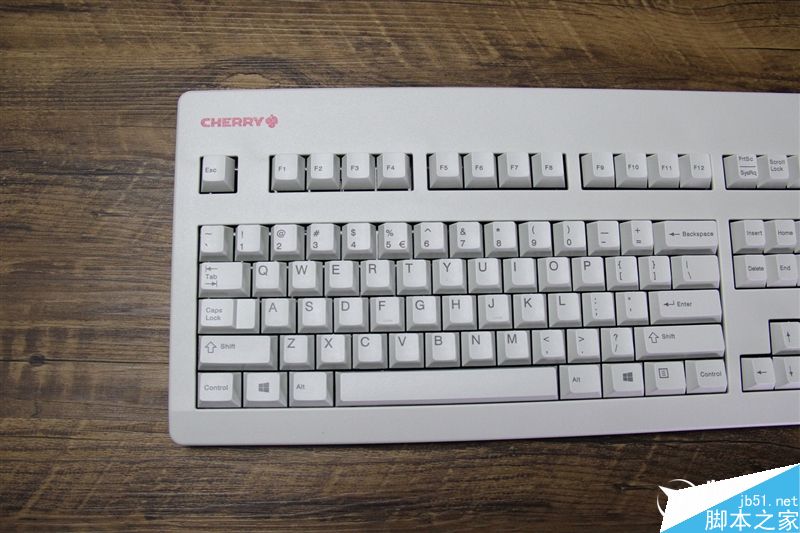 ↑↑↑復(fù)古的白色、經(jīng)典的104按鍵布局,左上角紅色的Cherry LOGO。鍵盤的長(zhǎng)度依舊保持在47cm,而寬度也是一致的20cm。F主鍵盤區(qū)與數(shù)字行距離依舊是2cm,鍵盤的重量為0.96kg。
