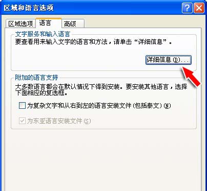 3、在“區域和語言選項”中,選擇“語言”項,點擊“詳細信息”