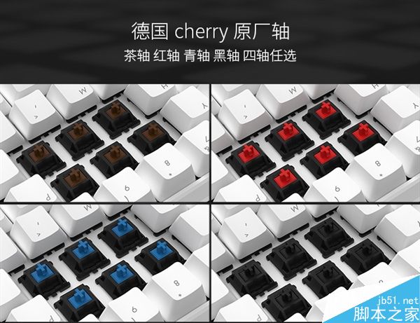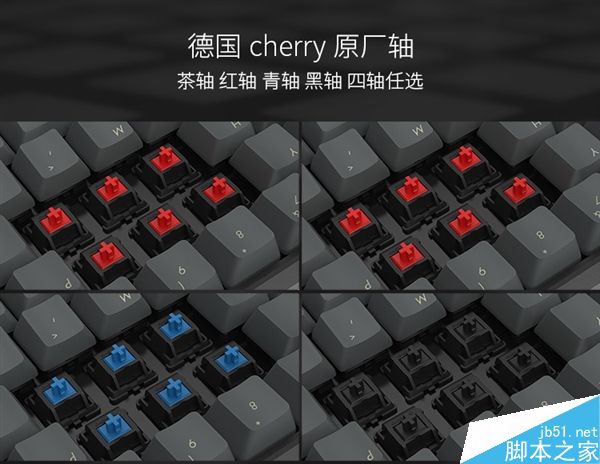 鍵帽依然是高品質、觸感舒適的PBT,搭配德國櫻桃原廠軸,可選茶軸、紅軸、青軸、黑軸。