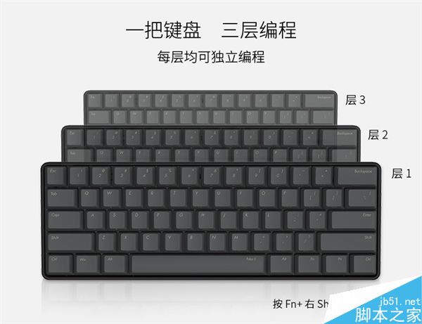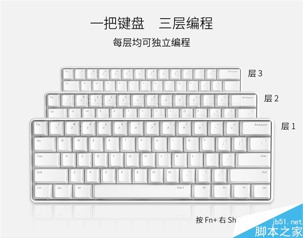 核心的編程方面,擁有三個邏輯層,可以對同一個鍵位進行三次編輯,每次編輯的內容可以分別保存,通過Fn加右Shift鍵切換,甚至還可以把Fn鍵、Pn鍵通過編輯移動位置,從而在60%的鍵盤上面使用獨立的方向鍵。