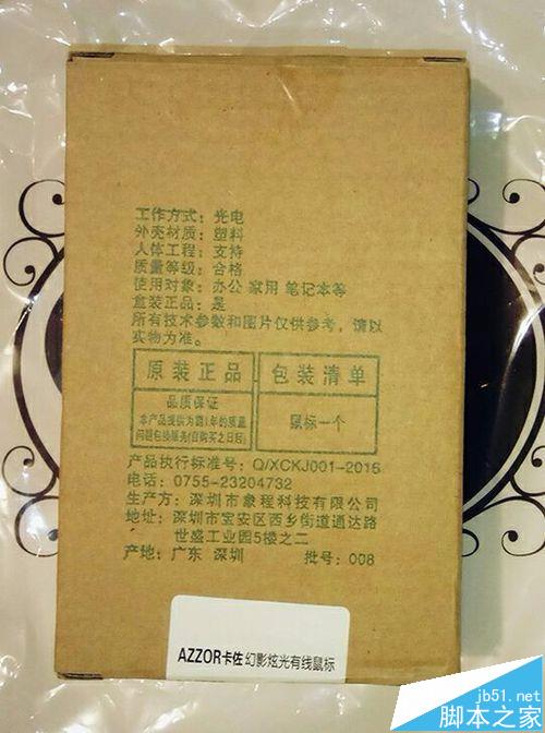 2、拆開(kāi)外包裝是一個(gè)盒子,盒子正面寫(xiě)著:綠色大行動(dòng),使用簡(jiǎn)易包裝,保護(hù)好森林,減少工業(yè)污染。盒子背面寫(xiě)著AZZOR卡佐幻影炫光有線鼠標(biāo)的字樣。可見(jiàn)包裝是很簡(jiǎn)單的。