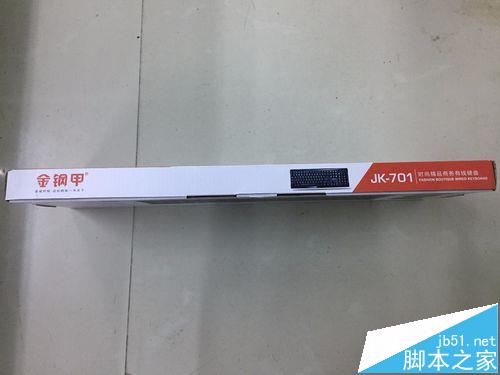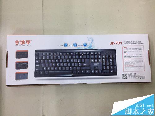 1、包裝上白色的底色,炫黑的鍵盤的圖案,簡約而不失大氣的設計,左上角金鋼甲標志。