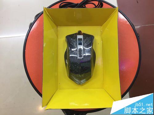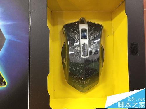 4、這個鼠標盒子采用的是粘扣帶打開的,這個比較方便我們使用,看到這個畫面也是比較炫彩的,鼠標的位置全是黃色。