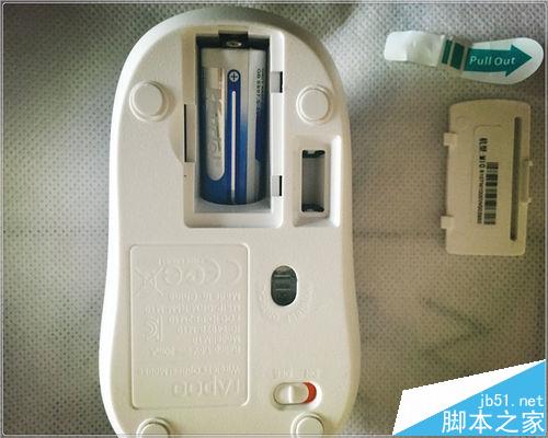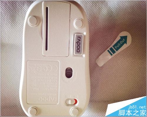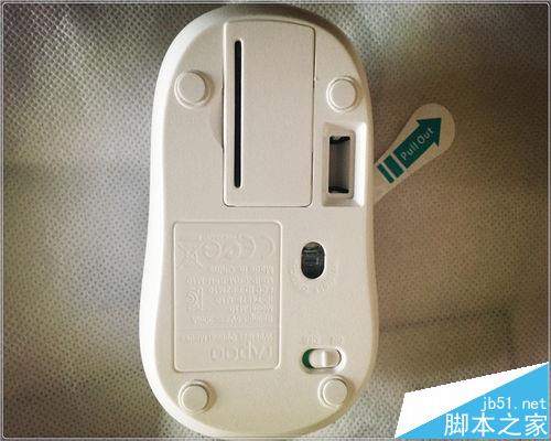 2、翻開M10無線鼠標的底部,可以看到有個電池口,一個Nano 接收器臨時放置槽、一個光電口、一個開關撥碼。新的M10鼠標默認配備一節(jié)AA電池,電池的一端有一個薄的塑料擋片擋住,要用時打開電池蓋,然后將塑料擋片抽出,這樣可以給M10正常供電。