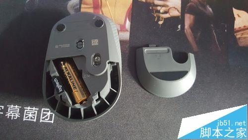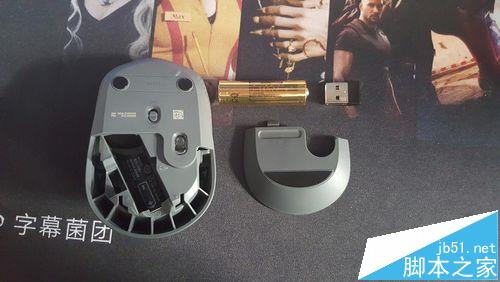 3、把鼠標翻過來打開電池倉就能看到電池和USB接收器