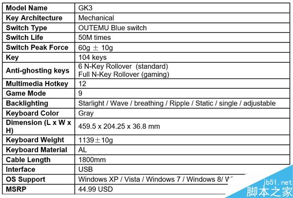 映泰GK3并沒有采用Cherry櫻桃軸,而是國產(chǎn)品牌歐特姆(Outemu)的青軸,來自東莞高特電子,5000萬次敲擊壽命,峰值力60±10克,標準模式六鍵無沖、游戲模式全鍵無沖,鍵帽均可更換。