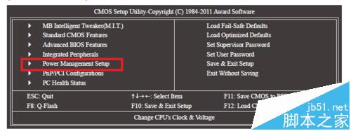 2、進入省電功能設定在BIOS設定程序主畫面選擇 <Power Management Setup>按<Enter>鍵進入省電功能設定。