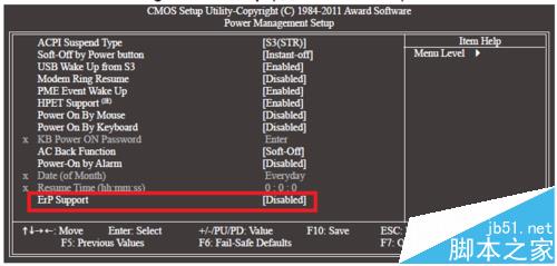 3、<ErP Support>的默認設置是<Disabled>,修改為<Enabled>。ErP Support選項提供您選擇是否在系統關機(S5待機模式)時耗電量低于1瓦。(預設值:Disabled)