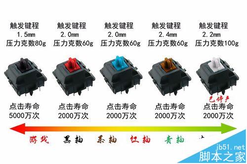 青軸:觸發鍵程為2.4mm,壓力為60g,點擊壽命為2000萬次,段落感明顯;