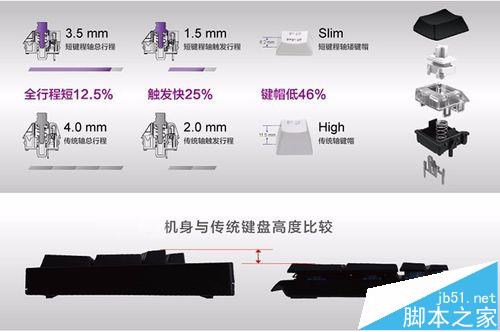 優點:超短軸觸發行程短,所使用的鍵帽與機身均為輕薄設計;方便攜帶。