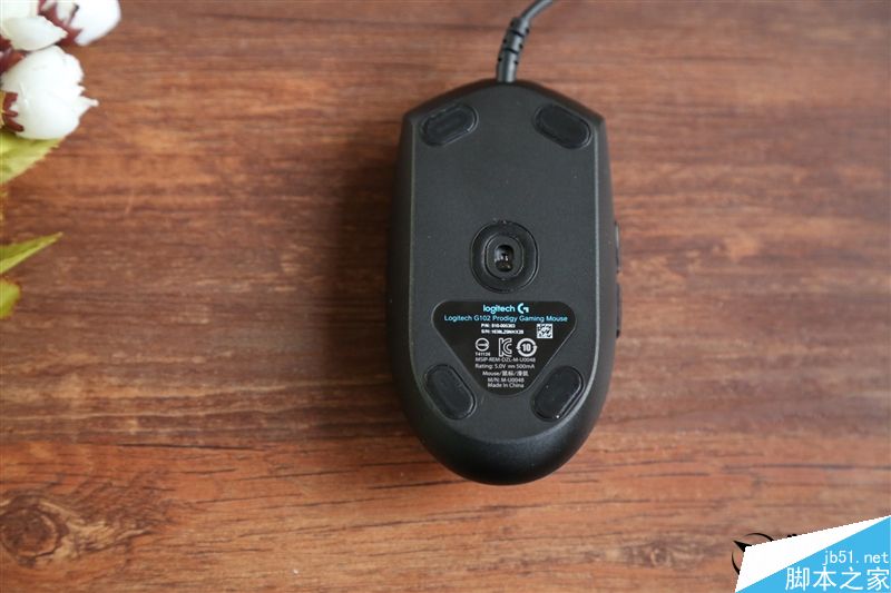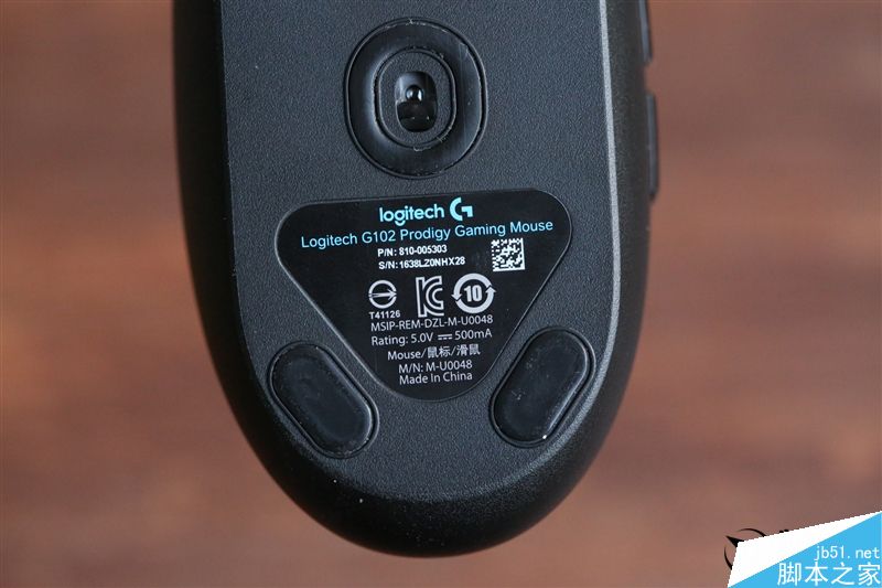 ↑↑↑羅技G102的底部設(shè)計十分簡約,中央部分是鼠標的尋跡龍引擎,四周為黑色特氟龍腳貼。