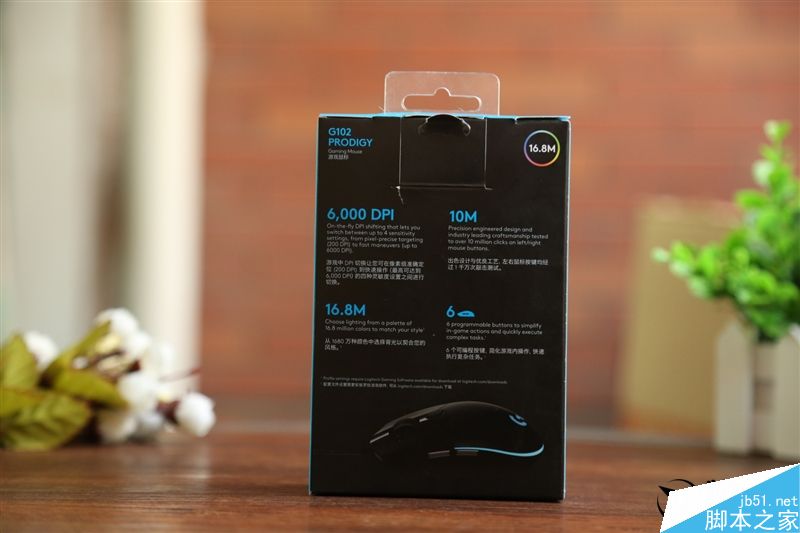 ↑↑↑包裝背面印有產(chǎn)品的特點,包括6000DPI、1000萬次壽命微動開關(guān)、RGB燈光和6個可編程按鍵等四大特性。