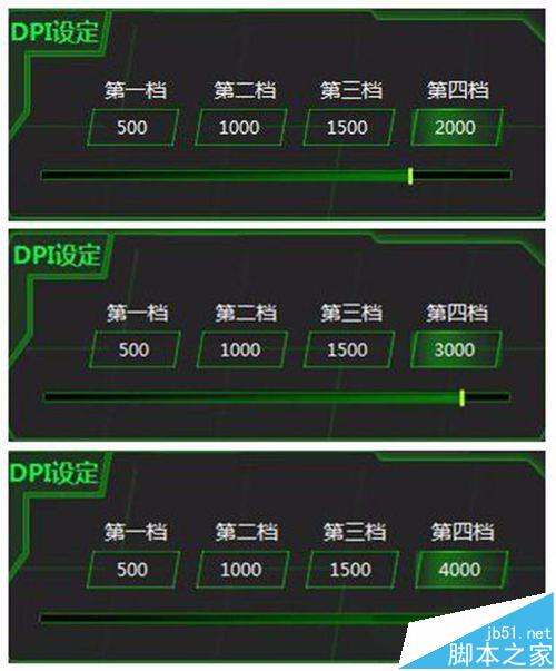3、DPI分為四檔,默認(rèn)分別是500、1000、1500、2000DPI。不過(guò)通過(guò)驅(qū)動(dòng)軟件可以調(diào)高到4000DPI,并且四檔均可以在250、500、750、1000、1250、1500、1750、2000、3000、4000十個(gè)值中設(shè)置,大家可以根據(jù)自己的手感和具體游戲來(lái)進(jìn)行自由設(shè)定。