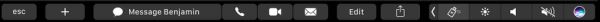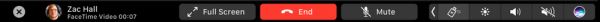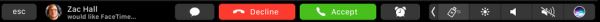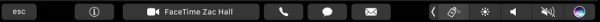 當(dāng)接到 FaceTime 來電呼叫時(shí),Touch Bar 會(huì)顯示大塊的綠色“接聽”按鈕,和紅色的“拒絕”按鈕。聯(lián)系人的姓名和照片會(huì)顯示在左側(cè)。在通話過程中,有全屏、結(jié)束通話和靜音等按鈕供用戶選擇。