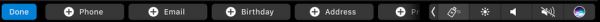 Touch Bar 的通訊錄應(yīng)用會(huì)顯示主應(yīng)用窗口當(dāng)前的聯(lián)系人卡片,在這里你可以快速撥打電話或 FaceTime,以及給該聯(lián)系人發(fā)送 iMessage。此外,Touch Bar 會(huì)根據(jù)用戶選擇聯(lián)系人的不同來更新按鈕,比如可以為某個(gè)聯(lián)系人增加新的信息,例如郵件、生日、住址。在編輯模式中,注意“esc”虛擬鍵會(huì)變成藍(lán)色的“Done”(完成)。