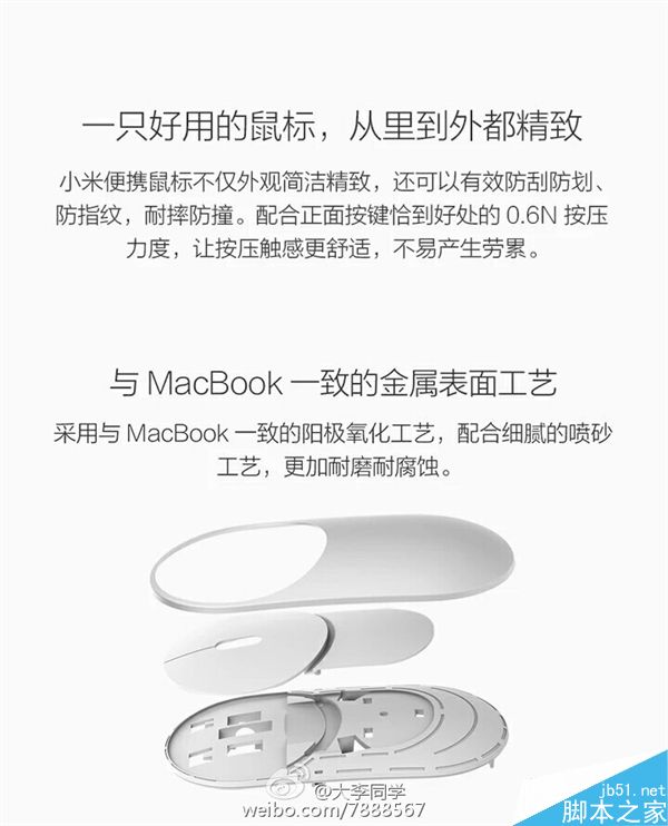 據(jù)介紹,小米便攜鼠標(biāo)外觀極簡設(shè)計(jì),采用和MacBook一樣的陽極氧化鋁合金外殼,防刮、防劃,耐摔防撞,按鍵為ABS材質(zhì),按鍵0.6N力度,手感舒適。鼠標(biāo)輕薄便攜,含電池僅重77.5g。