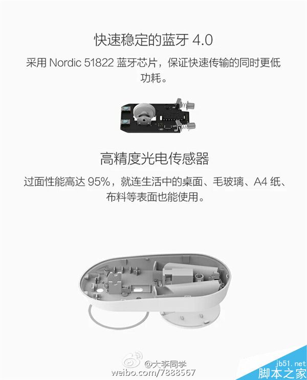 鼠標(biāo)支持藍(lán)牙4.0,采用Nordic 51822藍(lán)牙芯片,保證快速傳輸和低功耗,同時(shí)支持Wi-Fi連接。內(nèi)置高精度光電傳感器,1200dpi,過面性能高達(dá)95%(兼容桌面、毛玻璃、A4紙、布料等表面)。