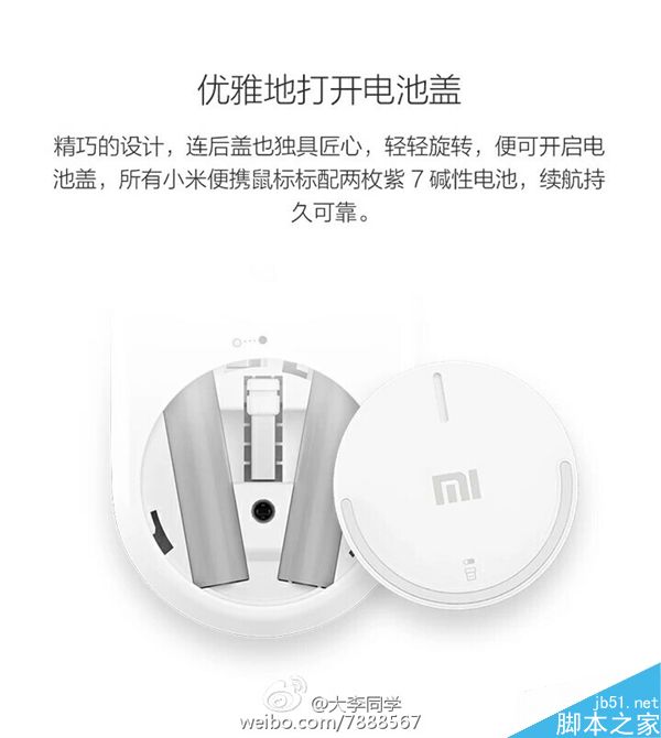 小米便攜鼠標(biāo)采用旋轉(zhuǎn)式后蓋,開啟更加優(yōu)雅便捷,采用兩枚7號電池供電。