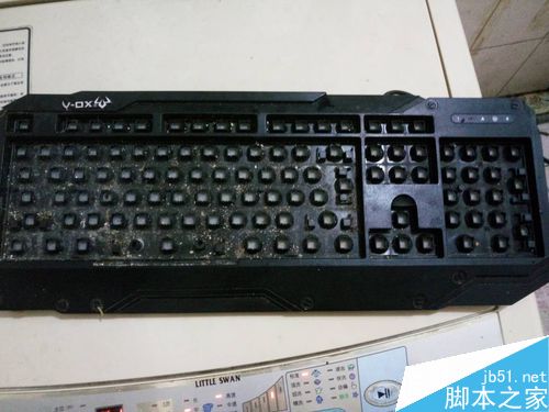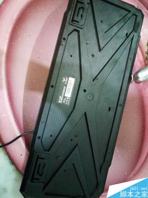 2、拿到洗手間,按照?qǐng)D中的樣子拍拍鍵盤的后面,讓里面的灰塵先空一空。