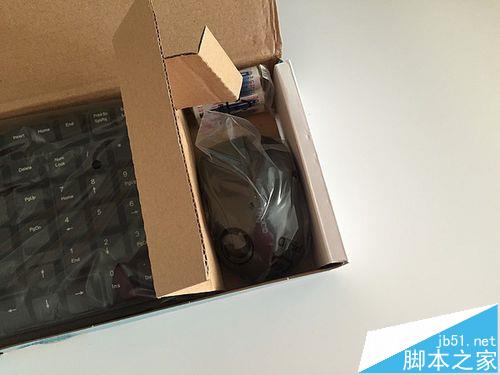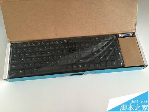 2、打開包裝盒,首先看到的是裝在塑料袋里的無線鍵盤,右側從上而下擱置著三節5號電池和鼠標: