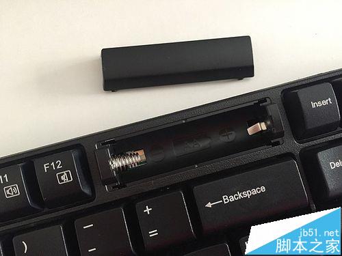 6、這款鍵盤的電池沒有設置背部,而是放于正面F12和insert中間,從左向右推動即可打開,內需置入一節5號電池: