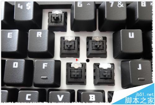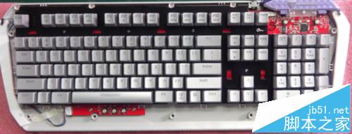 2、用螺絲刀取出機械鍵盤螺絲,拆下外殼,取出內(nèi)板;之后拔下需要更換按鍵周邊 的鍵帽,如圖。