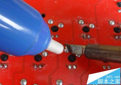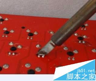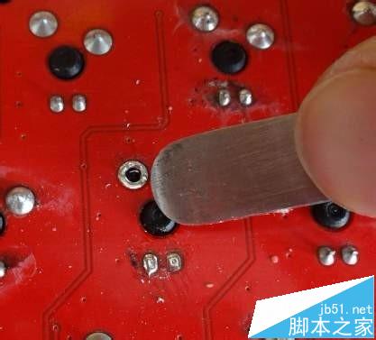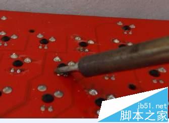 7、裝LED燈,這時要看一下LDE的正反,可看其他的燈是怎么放的。右手用烙鐵把燈后面的兩只腳燙熔,左手插入LDE并輕輕搖動。(也可以先將PCB上LED燈的兩個腳用吸錫器吸出,再裝LED燈)。另外,LDE的兩個腳不要有連錫的現(xiàn)象(容易燒板)。這樣,就輕松的把鍵盤的問題解決了。
