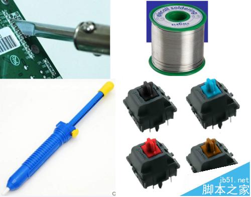 1、到網(wǎng)上購買如下物品:電烙鐵--刀形、松香芯焊錫絲、吸錫器和軸(需要根據(jù)鍵盤自身的腳位進行對比,有的是3腳,有的是4腳 ),以下用通過的3腳cherry軸為例。