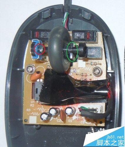 2、然后再卸開鼠標電板左右兩邊的小螺栓,小心的將主板取出來。取主板的時候,注意滾輪的右邊(綠色圓圈)是卡在一個凹型支架上的,取的時候注意方法,不要把左邊(紅色圓圈)處的細小塑料軸弄壞。