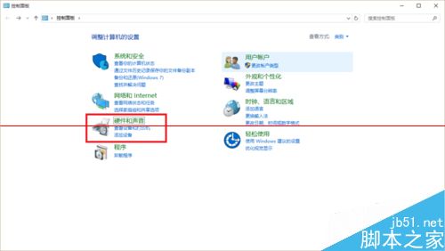 3、在打開的控制面板找到硬件和聲音(介于此時(shí)鼠標(biāo)左鍵已經(jīng)不能使用,你需要反復(fù)點(diǎn)擊鍵盤上的Tab鍵使虛線框切換到硬件和聲音選項(xiàng)上,然后點(diǎn)擊Enter進(jìn)入)