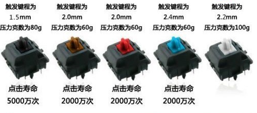 2、因為機械鍵盤按鍵下方都是單個的軸,而且大部分機械鍵盤都是使用Cherry生產的MX軸,所以根據MX軸的不同機械鍵盤也大體分為五種,黑軸、茶軸、青軸、紅軸以及白軸,還有近年來一些廠商自己開發的其它軸,本文暫不考慮。