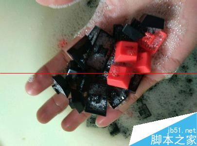 2、將拆裝好的鍵帽放入盆中,倒入洗滌精,用量大約為平時自己洗頭的量,然后用手直接清洗,然后放在通風(fēng)出晾干,要避免陽光暴曬。水溫最好控制在40度到60度,這樣的水溫最適宜各種酶對污垢的分解。