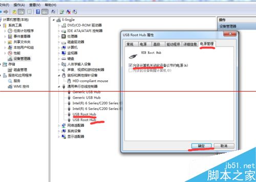 設備管理器中,在通用串行總線控制器下找到“USB ROOT HUB”,雙擊,然后打開“電源管理”選項卡,取消“對”,允許計算機關閉這個設備以節約電源的選擇,確定。
