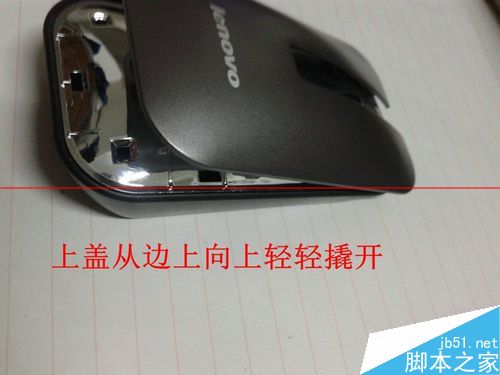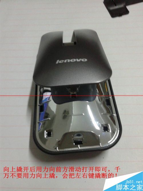 2、輕撬上蓋,抬起蓋子后不要再向上撬了,往前方用力滑到就可以取下上蓋,不要用蠻力,直接上撬的話會(huì)將左右鍵的扣合撬壞的!(小編的右鍵已經(jīng)被撬壞了:))檢查看看有沒(méi)有什么東西掉里了。