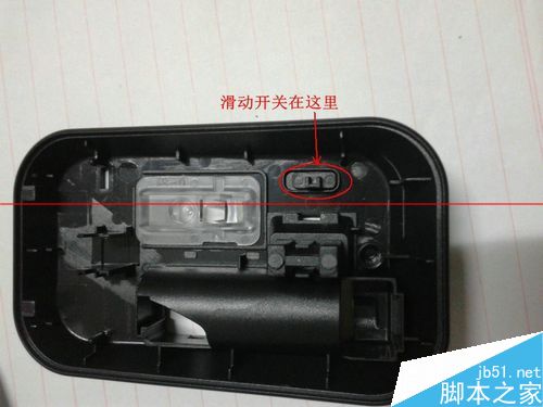 3、這下看到滑動(dòng)開(kāi)關(guān)了,是套在主板開(kāi)關(guān)上的一個(gè)外套,開(kāi)關(guān)套有些裂縫,估計(jì)是用力撥動(dòng)開(kāi)關(guān)沒(méi)裂縫大了,主板開(kāi)關(guān)反而沒(méi)有動(dòng),所以才導(dǎo)致失靈的。小編直接用502膠水滴在裂縫上固化了一下就可以了。