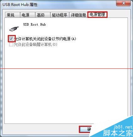 3、打開USB屬性設置窗口后,點擊“電源管理”標簽,取消選擇“允許計算機關閉此設備以節約電源”,然后點擊“確定”執行即可,如下圖所示: