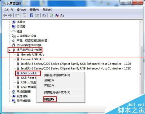 2、在設備管理器界面,點擊“通用串行總線控制器”,然后在子列表中右鍵點擊“USB Root Hub”,接著點擊“屬性(R)”,如下圖所示: