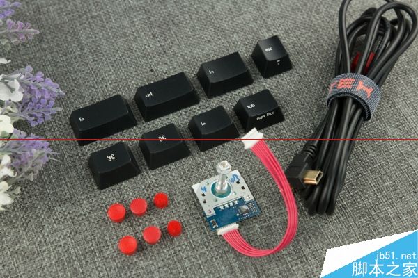 其實就本質上來說,TEX Yoda是一把很標準的60%鍵盤,并且設置了不少DIP鍵,能夠實現不同的鍵位功能。當然TEX Yoda讓不少人側目的原因,自然就是那個小紅點搖桿了。由于眾所周知的原因,在配件中能夠看到一個用于更換的搖桿零件,以及三對不同的搖桿帽。
