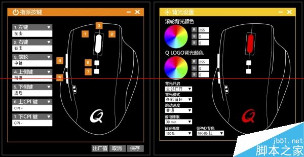 QPAD 8K Laser整體共有七個按鍵,均支持獨立編程,并且在驅動軟件中還可以進行宏錄制等強大功能。此外背光燈設置也同樣如此。QPAD 8K Laser的背光為RGB背光,滾輪與logo均可以設置不同顏色,并有背光模式、速度等選擇設置。此外諸如靜默高度、CPI切換等也在驅動軟件中實現。