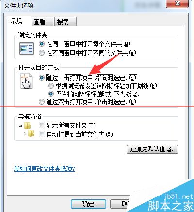4、進入文件夾選項對話框,找到【常規】選項,在打開項目方式中,可以看到系統默認的是鼠標雙擊打開文件。