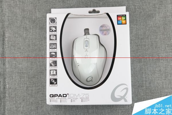 就從包裝設計上來說,QPAD OM-75這么樸素的除了是保持了QPAD一貫的設計之外,也與其年代久遠有關。左側(cè)是一連串以圖標表示的的特點,如CPI最高可達1600、鍍金接口、兩年保養(yǎng)、軟件驅(qū)動支持、光學引擎以及15G加速度和七個按鍵等。