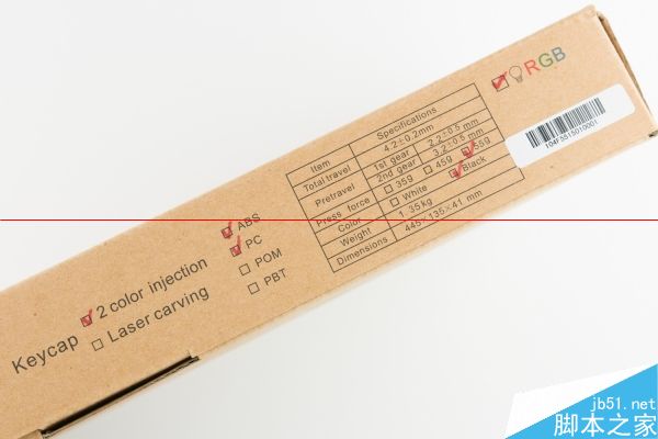 側(cè)面則是各種信息介紹。這回的Royal Kludge RC930比Noppoo 108EC-Pro可選設(shè)置多了不少,包含了鍵帽工藝、鍵帽材質(zhì)、壓力數(shù)、鍵盤顏色以及最為重要的RGB背光。其中鍵帽材質(zhì)分別有ABS、PC、POM以及PBT,而鍵帽工藝則有二色成型與普通的鐳雕。靜電容壓力數(shù)分別有35g、45g以及55g,并可從軟件進行觸發(fā)調(diào)整。