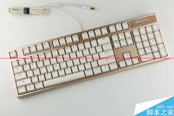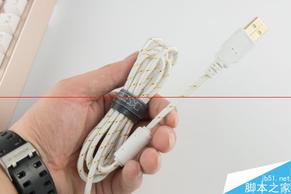 凱酷Hero RGB為非鍵線分離設計,雖然其依然有固線設計。線材方面,凱酷Hero RGB使用了與鍵盤本體點題的白金色線材,并有鍍金接口、屏磁環以及束線帶。
