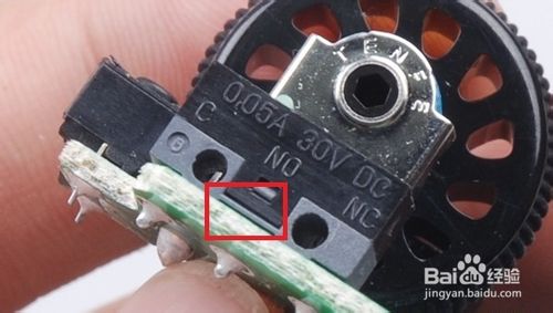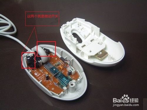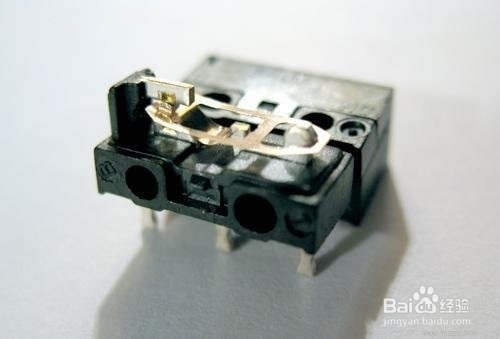 2、鼠標按鍵位置的兩個元件就是鼠標微動開關,如圖,接下來拆開這個進行修理,拆下來的時候要非常小心,非常容易變形,到時候手感就不好了。