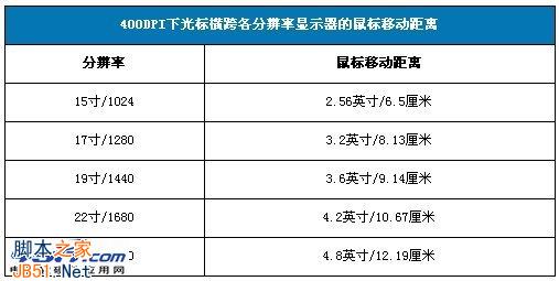 從上圖可以看到,假如使用400DPI的分辨率,在1024x768的分辨率下(該分辨率為17寸CRT的最佳分辨率,也是15寸LCD的分辨率),從屏幕最左端移動到最右端,我們僅需要1024/400=2.56英寸=6.5024厘米,800DPI的話僅需要3.25厘米,對于我們日常操作來說還是可以接受的。同理可以得出: