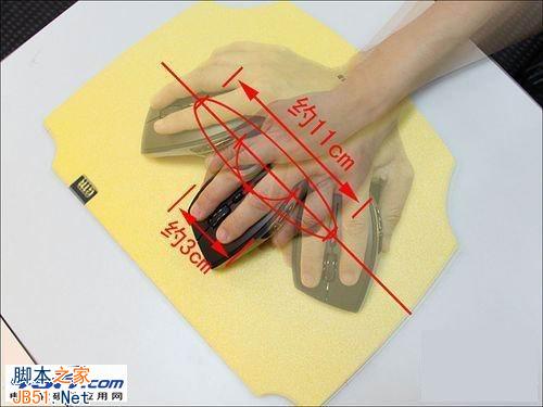假設鼠標的定位引擎位于鼠標的中間位置,那么,經過測量,我們發現靠手腕來擺動鼠標,鼠標引擎的最大移動距離大約有11厘米。不過,除了激烈游戲外,日常操作中我們很少會這樣大幅度地擺動鼠標,因為這樣容易造成腕部的疲勞。因此,比較舒服的鼠標操作的擺動范圍是上圖中間小弧形范圍,筆者試驗結果大約是3厘米,也就是比一英寸稍長一點。(此數據以筆者的手來估量,僅供參考)